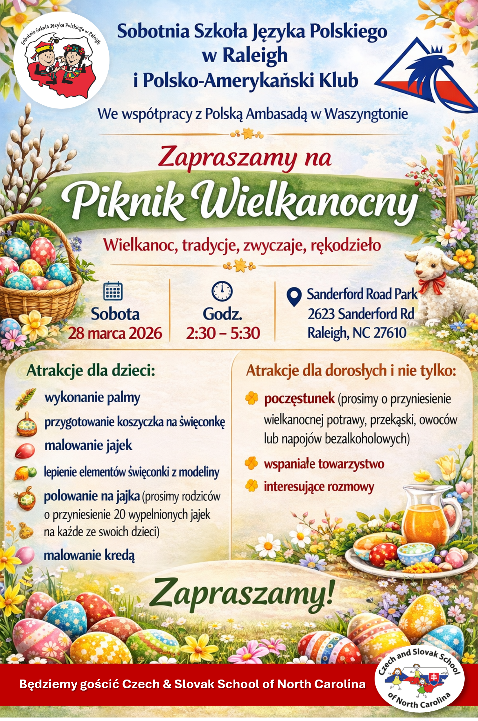 Serdecznie zapraszamy dzieci, rodziców i wszystkich miłośników polskich tradycji na Piknik Wielkanocny organizowany przez Sobotnią Szkołę Języka Polskiego w Raleigh oraz Polsko-Amerykański Klub we współpracy z Polską Ambasadą w Waszyngtonie.